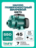 • Насос поверхностный TAIFU JET80, корпус чугун, напор 33м, 50л/мин,Обмотка двигателя медь, кабель с вилкой 1,5м