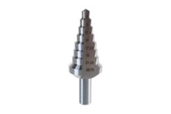 Ступенчатое сверло конусное имеет острый наконечник, благодаря которому не требуется использование центрирующих сверл. Конструкция этого инструмента позволяет в процессе работы переходить от диаметра к диаметру. Используется как в станках, так и ручных дрелях. В зависимости от материала, по которому нужно производить работы, стоит выбирать сверла соответствующей твердости: биметаллические коронки (для сверления твердых металлов), алмазные коронки (для работ по бетону, стеклу, керамике).