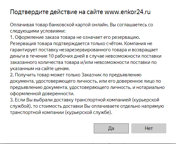 Если Вы согласны с этими условиями и нажимаете "ДА", то Вы будете перенаправлены на платежный шлюз, где Вы сможете указать реквизиты Вашей банковской карты*. Если нажимаете "НЕТ", то вернётесь в корзину и сможете выбрать другой способ оплаты. Соединение с платежным шлюзом и передача параметров Вашей пластиковой карты осуществляется в защищенном режиме с использованием 128-битного протокола шифрования SSL.