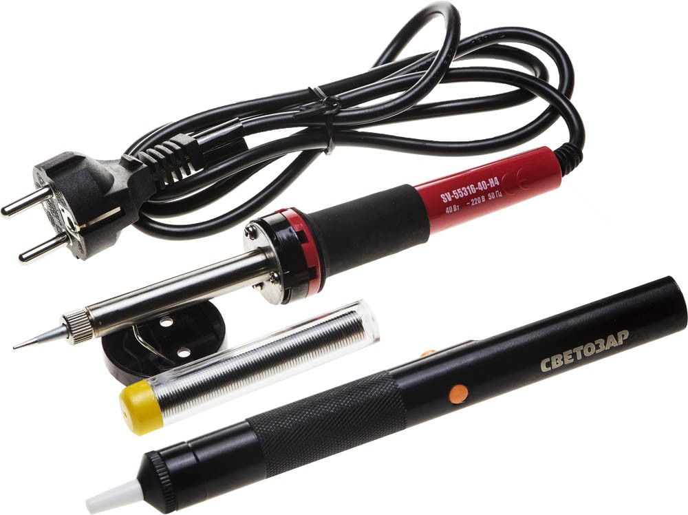 Набор для паяльных работ СВЕТОЗАР 40Вт SV-55316-40-H4 - это комплект из 4 предметов, которые применяются для монтажа и демонтажа электронных устройств и проводников на печатные платы.