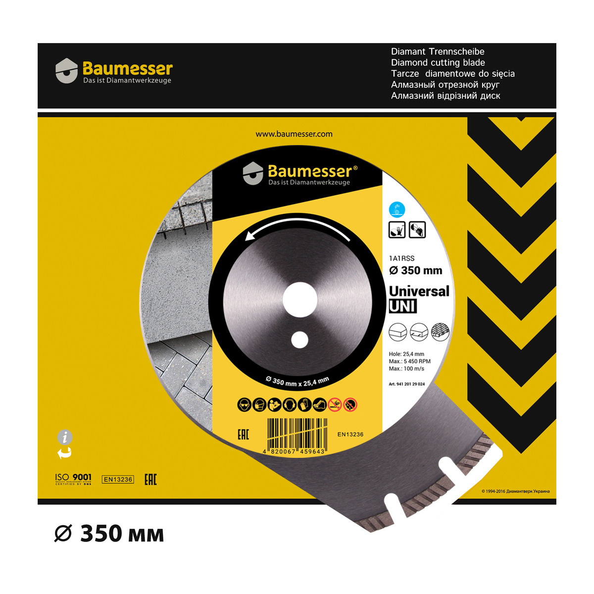 1A1RSS/C3 350x3,5/2,5x10x25,4-11,5-24 HIT Baumesser Uni PLUS. При незначительном увеличении Рекомендованной Розничной Цены (РРЦ) + 14%, данная новинка обеспечивает увеличение показателя ресурса диска +20% и скорости резания +25%, а также более чистую кромку обрабатываемой поверхности, которая обеспечивается узким пазом (С3).
