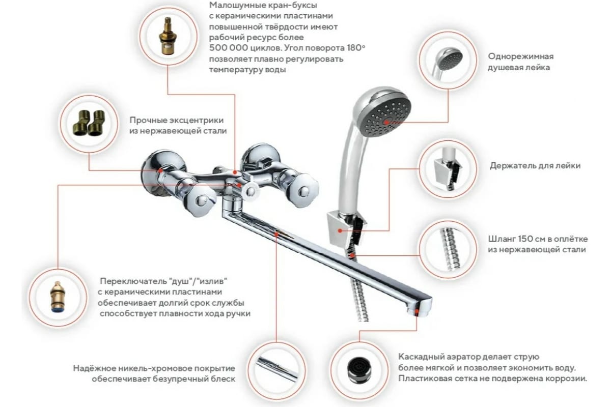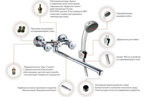 Рабочими элементами выступают кран-буксы с керамическими пластинами с углом поворота 180̊, что позволяет настраивать температуру и напор воды с высокой степенью точности. Керамический переключатель направления потока воды.