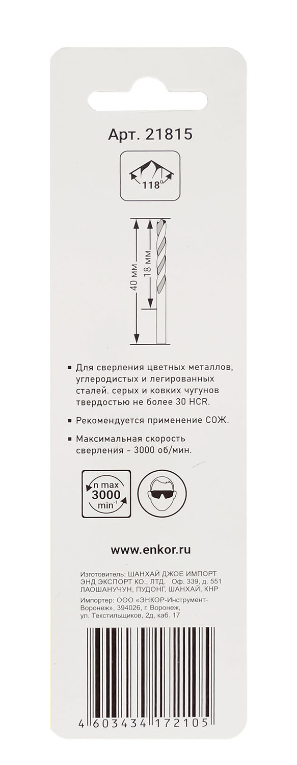 Сверло Энкор 21815 предназначено для обработки цветных металлов, углеродистых и легированных сталей, серых и твердых чугунов твердостью не более 30 HCR.