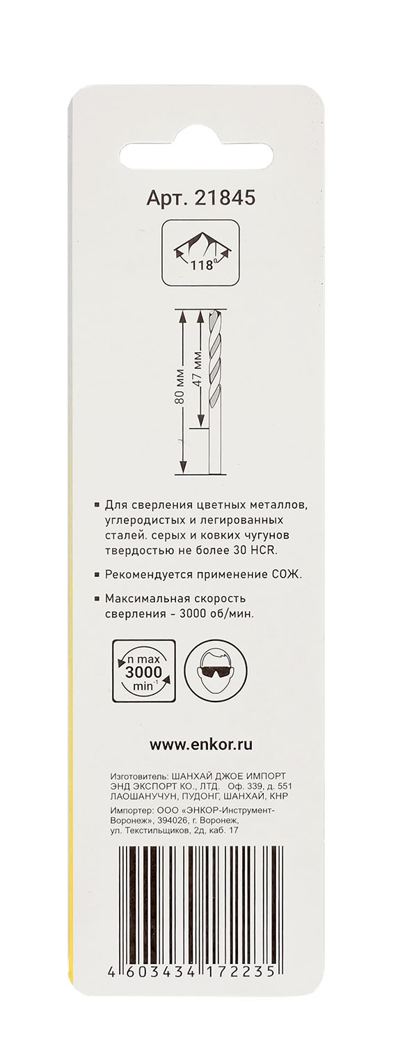 Сверло Энкор 21845 подходит для сверления цветных металлов, легированных и углеродистых сталей, серых и ковких чугунов твердостью не более 30 HCR.