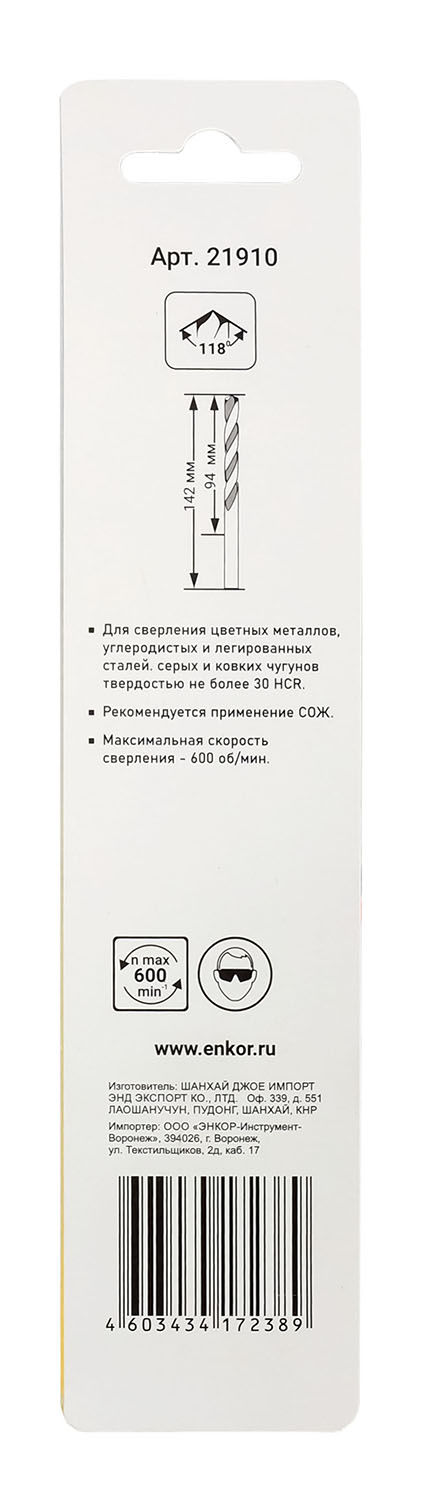 Сверло Энкор 21910 подходит для сверления цветных металлов, легированных и углеродистых сталей, серых и ковких чугунов твердостью не более 30 HCR.