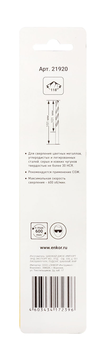 Сверло Энкор 21920 подходит для сверления цветных металлов, легированных и углеродистых сталей, серых и ковких чугунов твердостью не более 30 HCR.