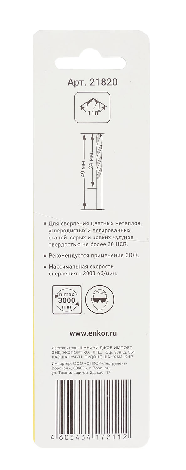 Сверло Энкор 21820 предназначено для обработки цветных металлов, углеродистых и легированных сталей, серых и твердых чугунов твердостью не более 30 HCR.