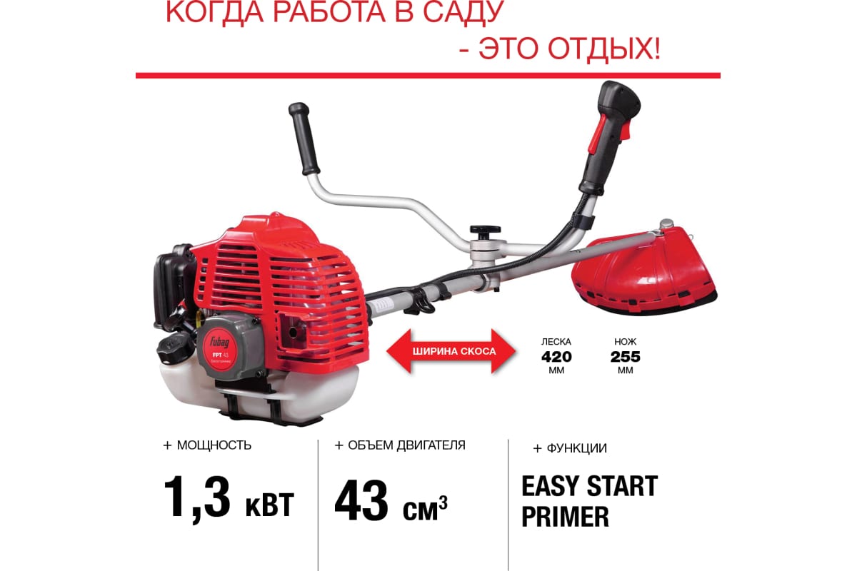 Бензотриммер FUBAG FPT 43 служит для кошения травы и сорняка на различных поверхностях, для чего комплектуется как полуавтоматической катушкой с леской, так и трехлопастным ножом.