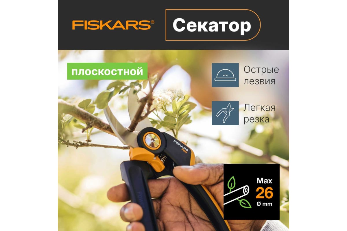 Плоскостной секатор Fiskars X-series PowerGear L P961 1057175 предназначен для ухода за садовыми растениями, идеален для срезания свежих веток и стеблей диаметром 2.6 см.