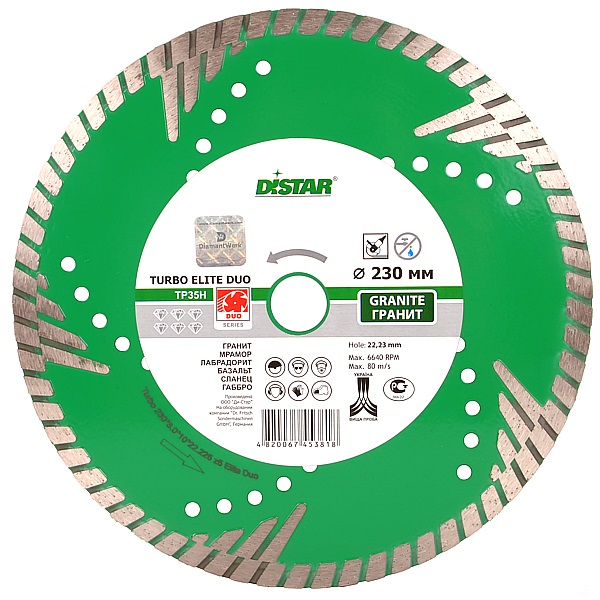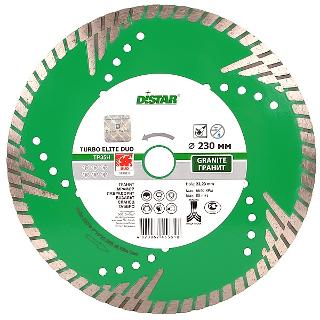 Алмазный круг для ручных углошлифовальных машин от компании DISTAR 1A1R 230 TURBO ELITE DUO это специально разработанный круг с турбированной поверхностью для резания гранита, прочных кварцитов, литого бакора и некоторых видов кирпича.