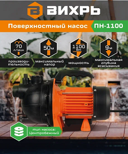 Поверхностный насос Вихрь ПН-1100 68/4/9 используется для забора чистой воды воды из резервуаров или колодцев, подойдет для организации водоснабжения в загородном доме.