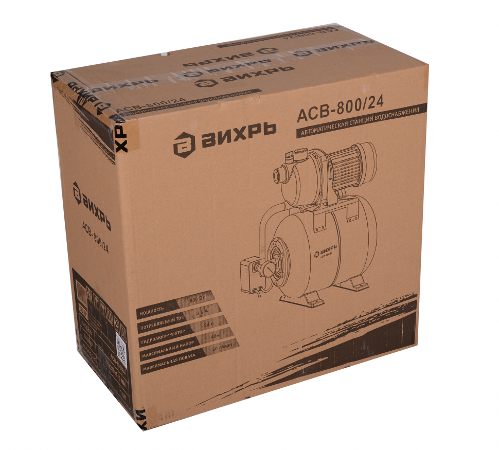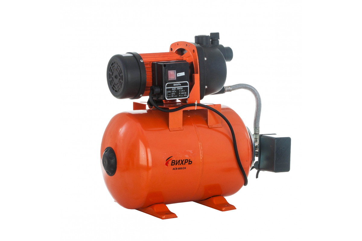 Насосная станция Вихрь АСВ - 800/24 используется в качестве силового агрегата водопроводной системы в саду или на даче, служит для подъема грунтовых вод с глубины до 9 метров.