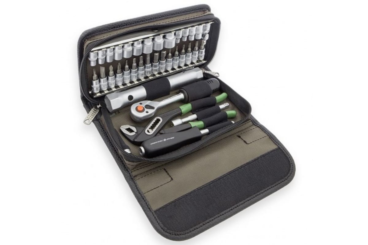 Набор головок 1/4 с инструментом в фирменной сумке, 37 предметов Дело Техники 600937 подходит для обслуживания мотоциклов, автомобилей и выполнения других работ. Сложенная сумка легко помещается в кофре мотоцикла.