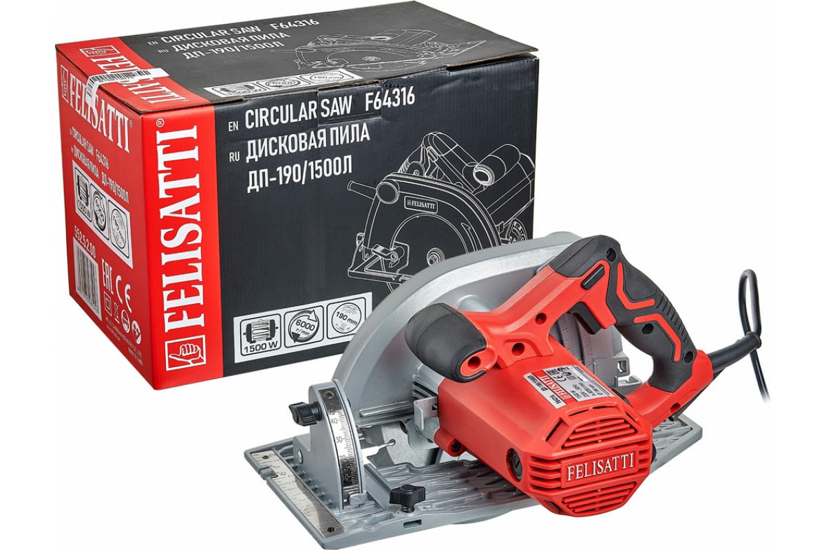 Дисковая (циркулярная) пила FELISATTI ДП-190/1500 Л предназначена для продольного, а также поперечного резанья древесины, материалов из древесины – фанеры, ДСП, ОСП, МДФ, других композитных материалов, пластика, цветных металлов.