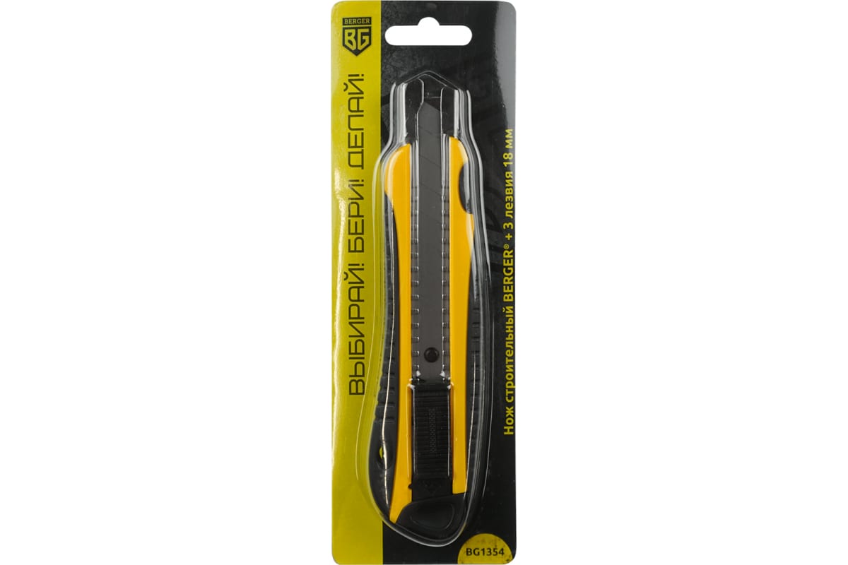 Строительный нож BERGER 18мм, с 3-мя лезвиями в комплекте BG1354 предназначен для работ как с плотными материалами, так и для работ с мягкими, например тканями. Оснащен сегментированным лезвием 0,5мм*18мм*100мм из японской стали SK4, которое долгое время сохраняет остроту заточки.