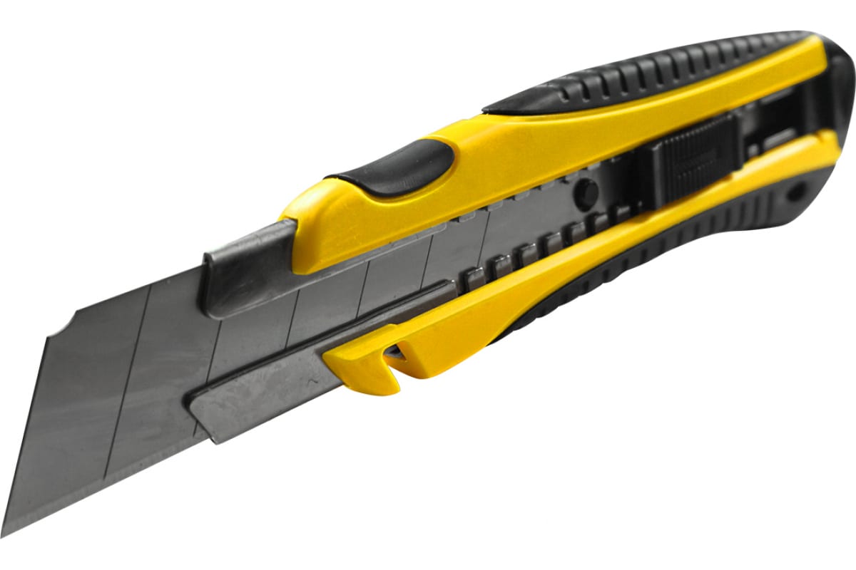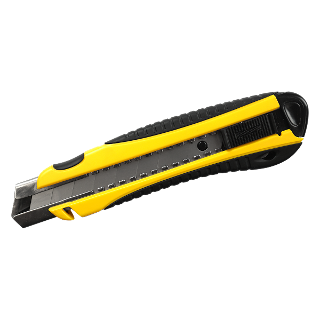 Корпус выполнен в эргономической форме из 2-х компонентного пластика с прорезиненными мягкими вставками для надежного захвата с автоматическим регулированием длины лезвия. Съемный наконечник ручки ножа позволяет быстро обломить затупившийся сегмент лезвия. На корпусе есть паз для резки шнуров и стяжек.