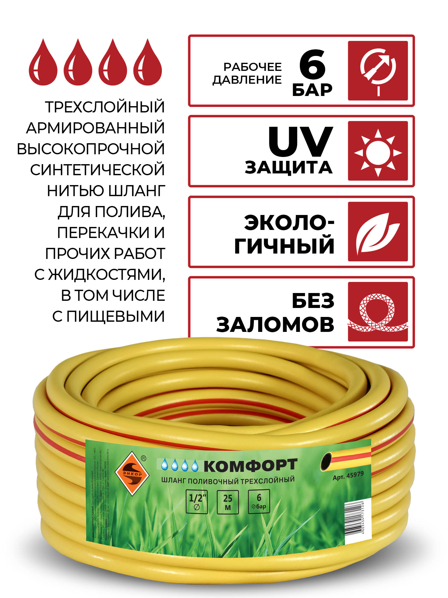 Трехслойный, армированный высокопрочной синтетической нитью шланг для полива, перекачки и прочих работ с жидкостями, в том числе с пищевыми. Внутренний слой ПВХ непрозрачный, черный, защищает от проникновения солнечных лучей и препятствует образованию водорослей внутри тела шланга. Наружный ПВХ слой непрозрачный, окрашенный, имеет продольную цветную полосу, а так же специальные защитные добавки от воздействия внешних факторов, таких как ультрафиолетовое излучение, истирание. Между внутренним и наружным ПВХ слоями проложен высокопрочный плетеный корд из высокопрочной синтетической нити. Благодаря повышенным качественным показателям этот вид шланга имеет более высокие эксплуатационные характеристики (не заламывается и не перегибается).