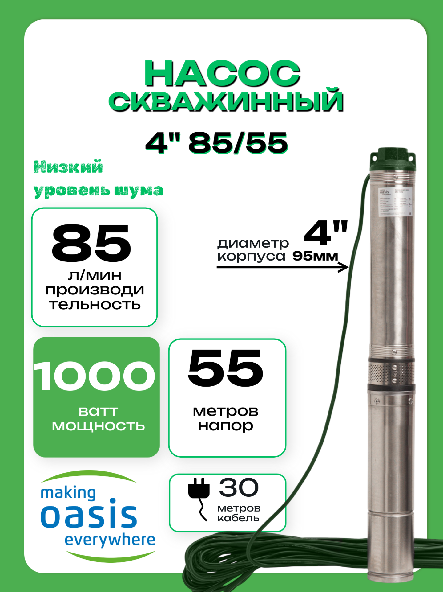 • Скважинный насос Oasis  85/55  применяется для подачи чистой воды из скважин, колодцев и открытых водоемов.