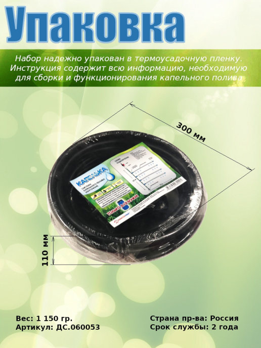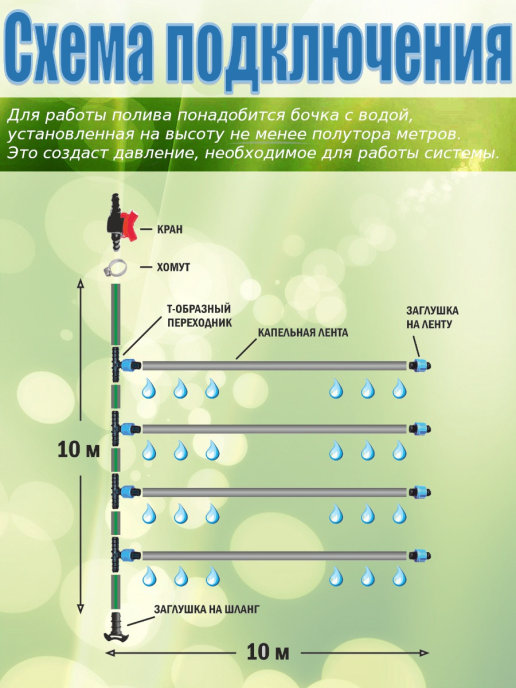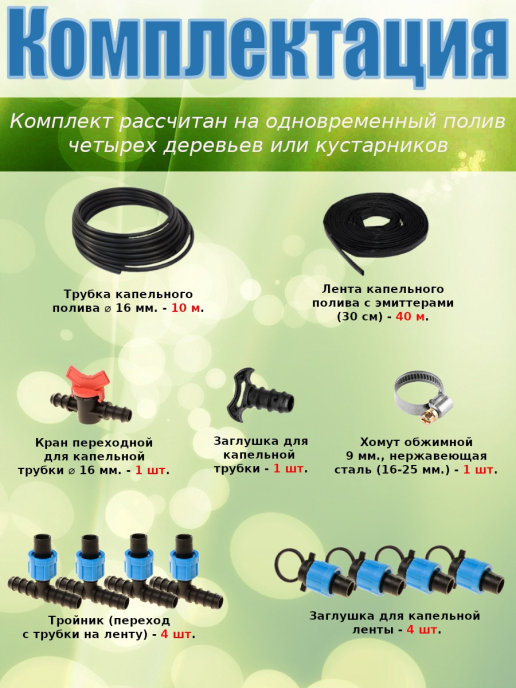 • Набор рассчитан на полив участка размером 10x10 метров (ориентировочно 4 грядки).