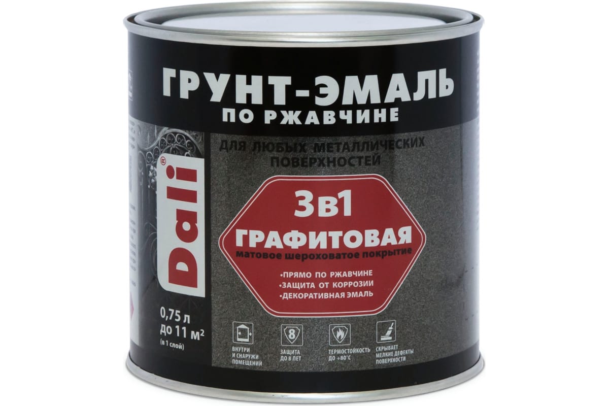 Графитовая грунт-эмаль по ржавчине РОГНЕДА Dali 3 в 1 темная медь; 0.75 л предназначена для защитно-декоративной обработки стальных и чугунных поверхностей, цветных металлов, поверхностей из оцинкованного металла и нержавеющей стали, биметаллических поверхностей (радиатор отопления), а также пораженных точечной или сплошной коррозией поверхностей c толщиной ржавчины до 100 мкм.