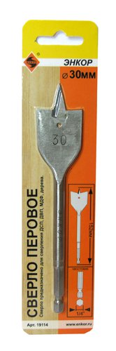 • Перовое сверло Энкор 19114 предназначено для выполнения сквозных и глухих отверстий в заготовках из мягких и твердых пород древесины.
