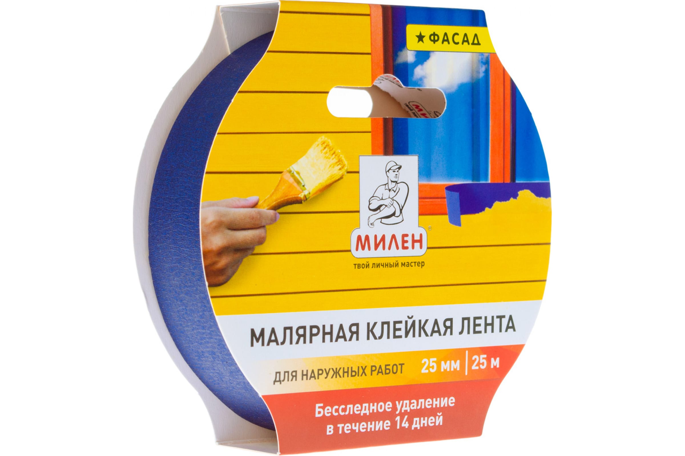 Малярная лента Милен бумажная, фасадная, 25 мм х 25 м, 72 шт. обладает следующими свойствами: высокая клейкость,у стойчивость к УФ-излучению, бесследное удаление с поверхности в течение 14 дней, термостойкость (до 60°С), эффективное применение снаружи и внутри помещения, привлекательная яркая упаковка.