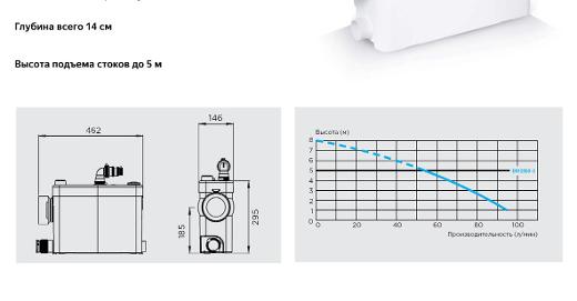 Откачивает сточные воды до 100 метров по горизонтали и до 5 метров по вертикали.
