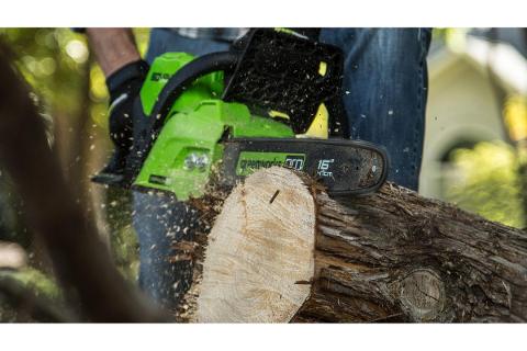 Бесщеточная аккумуляторная цепная пила Greenworks GD60CS40 60 В 2006907 применяется для распила древесины на частных участках.