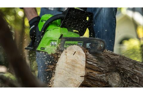Бесщеточная аккумуляторная цепная пила Greenworks GD60CS40K2 60 В, с АКБ 2 А*ч и ЗУ 2006907UA предназначена для валки и распила деревьев.
