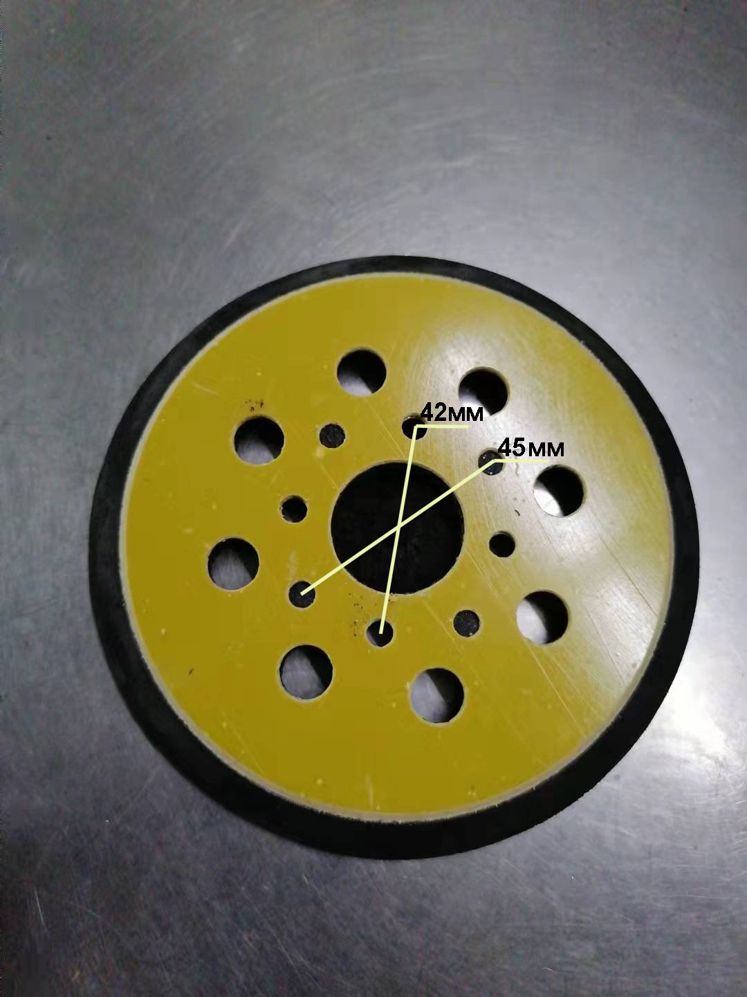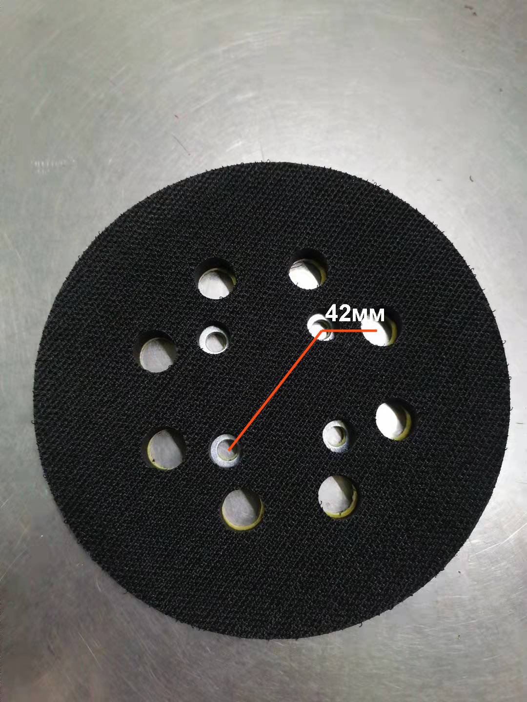 Подходит также для эксцентриковых машин с расстоянием между центрами крепёжных отверстий 45 мм. Для этого на пластиковой подошве опорной тарелки предусмотрены отверстия, которые надо продолжить сверлом такого же диаметра через губчатую основу и расширить потом со стороны губчатой основы до диаметра головки крепежа.