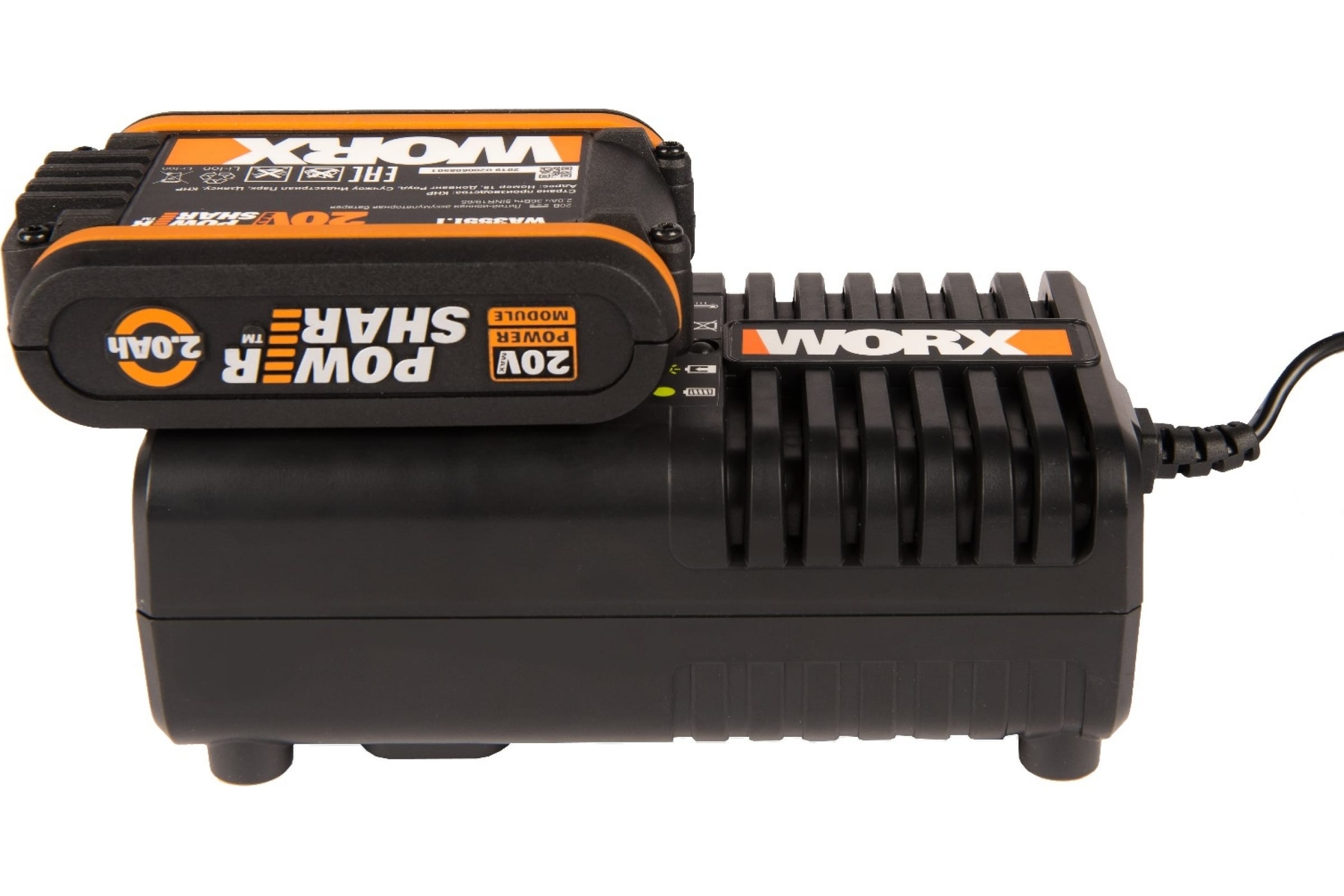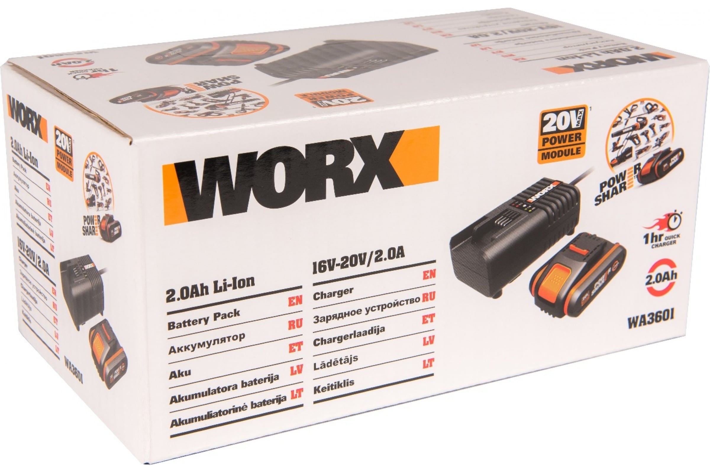 Набор 3601 аккумулятор 2 Ач, зарядное устройство 2А WORX WA3601 подходит для любого аккумуляторного инструмента WORX. Для инструмента напряжением 20 В необходим 1 аккумулятор PowerShare 20В, для инструмента напряжением 40 В необходимо 2 аккумулятор PowerShare 20 В, а для инструмента напряжением 80 В необходимо 4 аккумулятора PowerShare 20 В.
