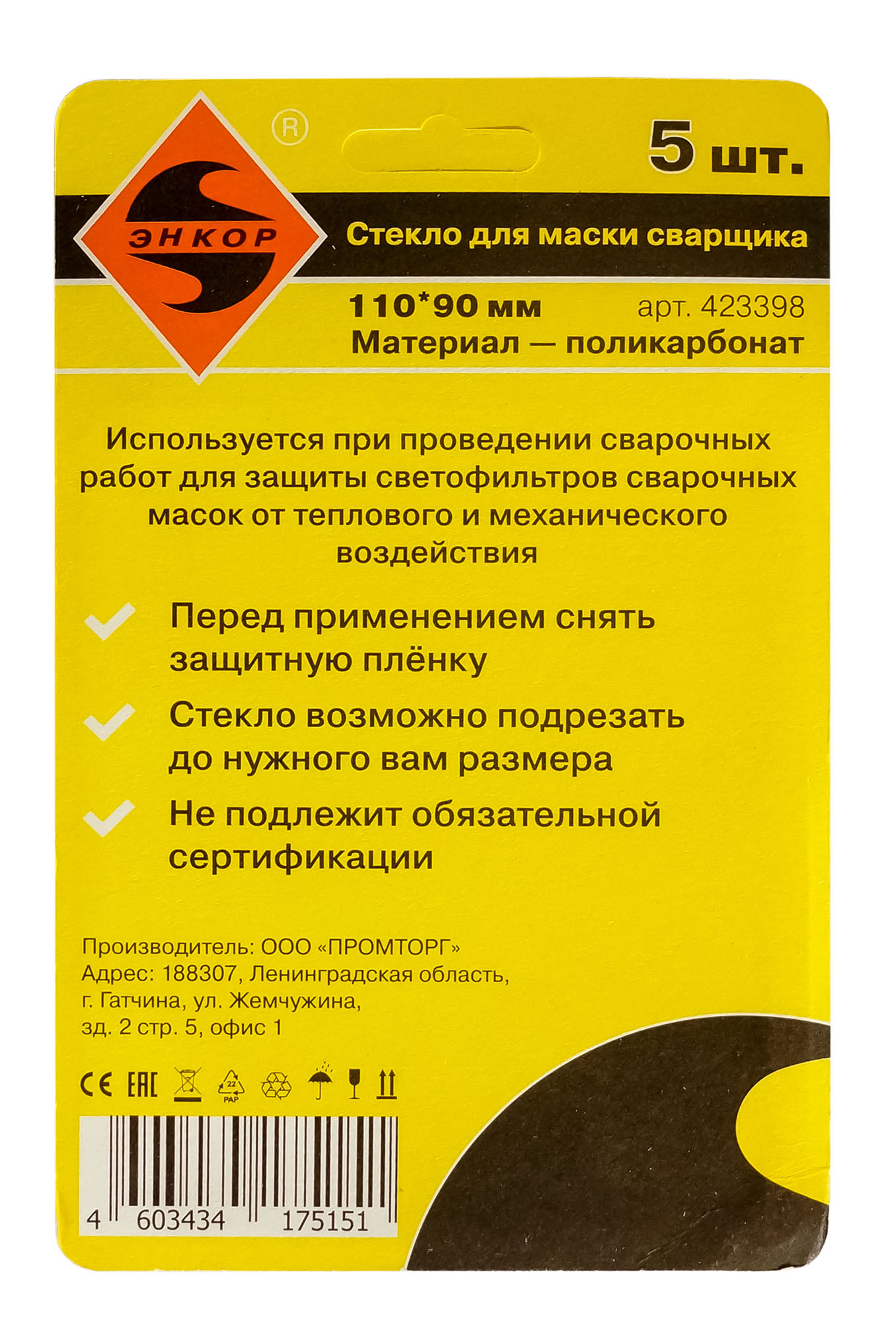 Стекло для маски сварщика 110х90 поликарбонат 5 шт Энкор (423398)