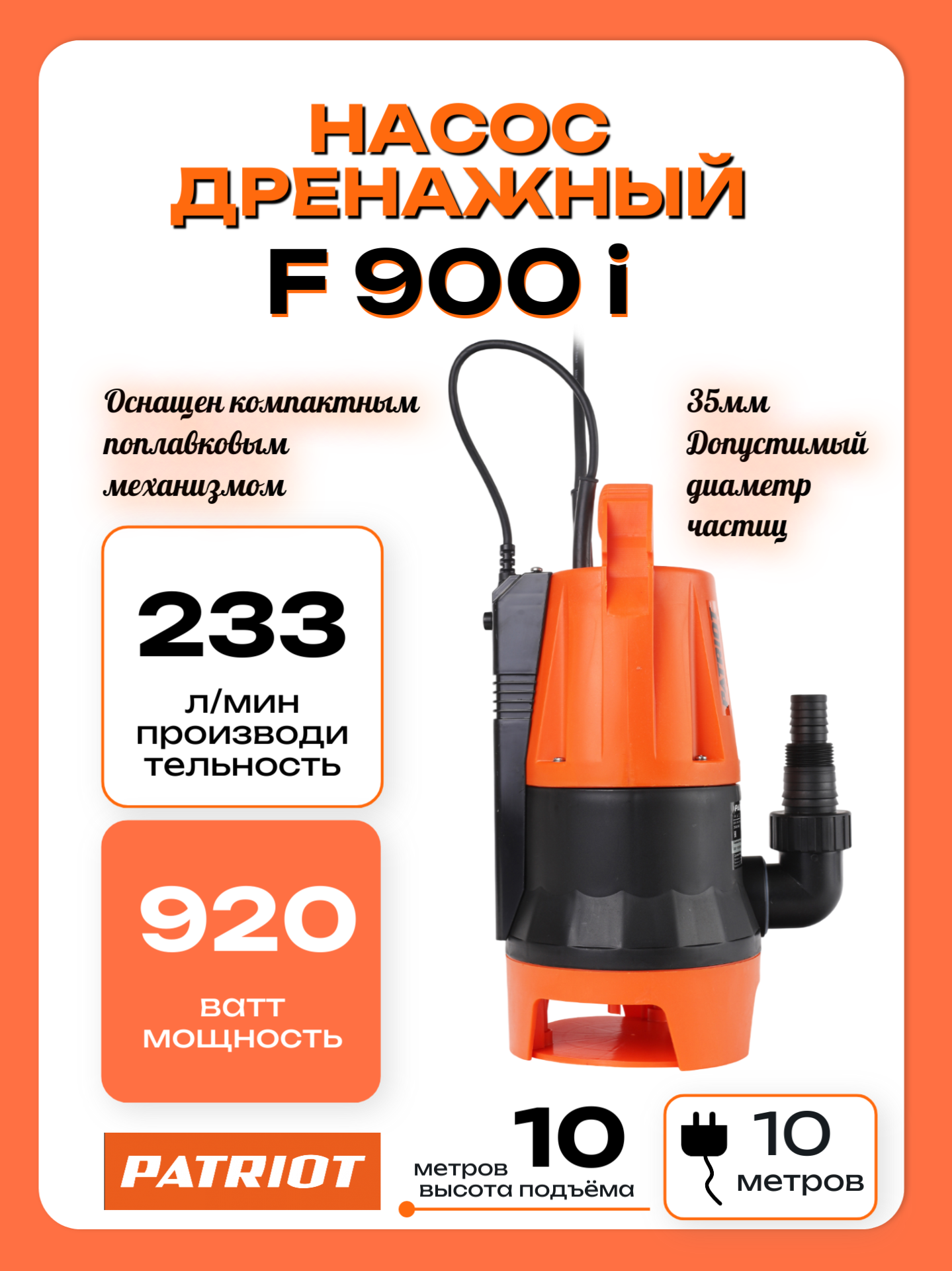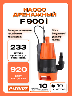 • Дренажный насос PATRIOT F 900i 315302468 используется для перекачивания загрязненной воды с диаметром взвешенных частиц до 35 мм.