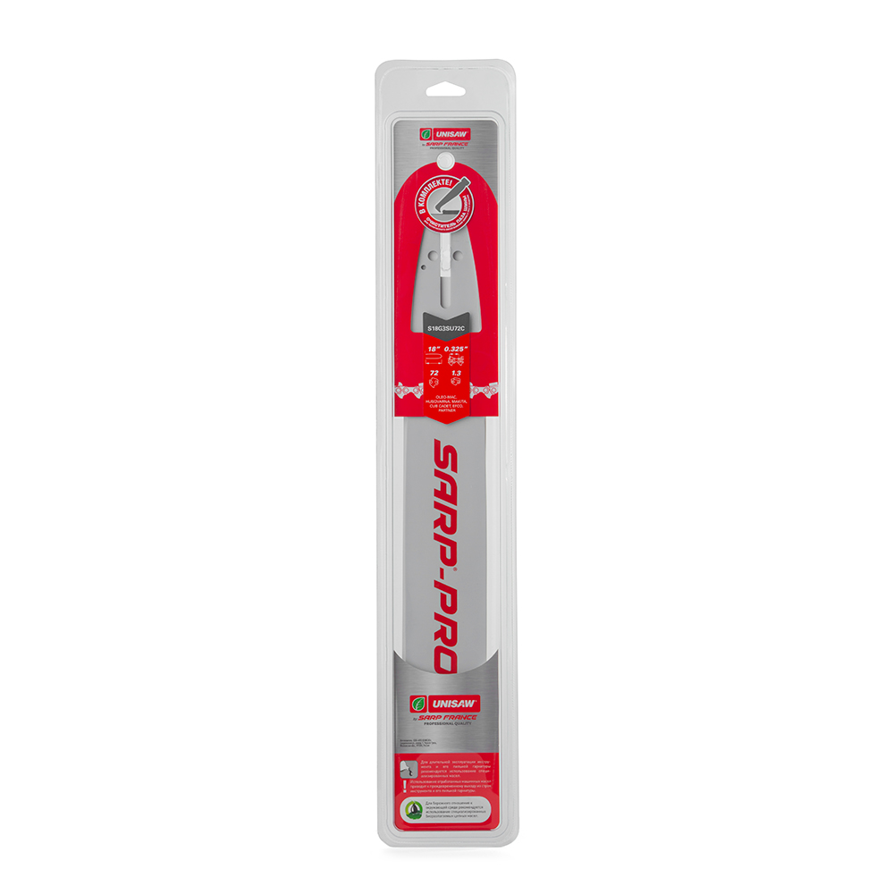 • Ламинированная пильная шина Unisaw Professional Quality (арт. S18G3SU72C): Длина 18”, шаг 0,325”, толщина паза 1,3 мм.