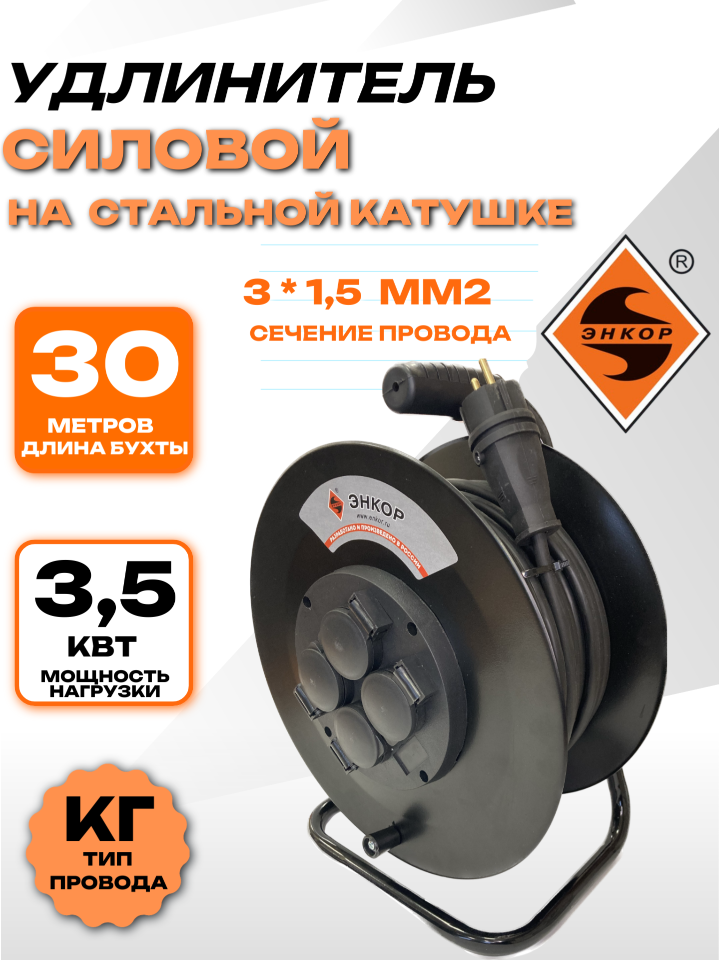 Удлинитель силовой, влагозащищённый, морозостойкий с металлической катушкой 30 метров 4 розетки 3500 Вт, КГ 3*1,5 мм2ХАРАКТЕРИСТИКИ: