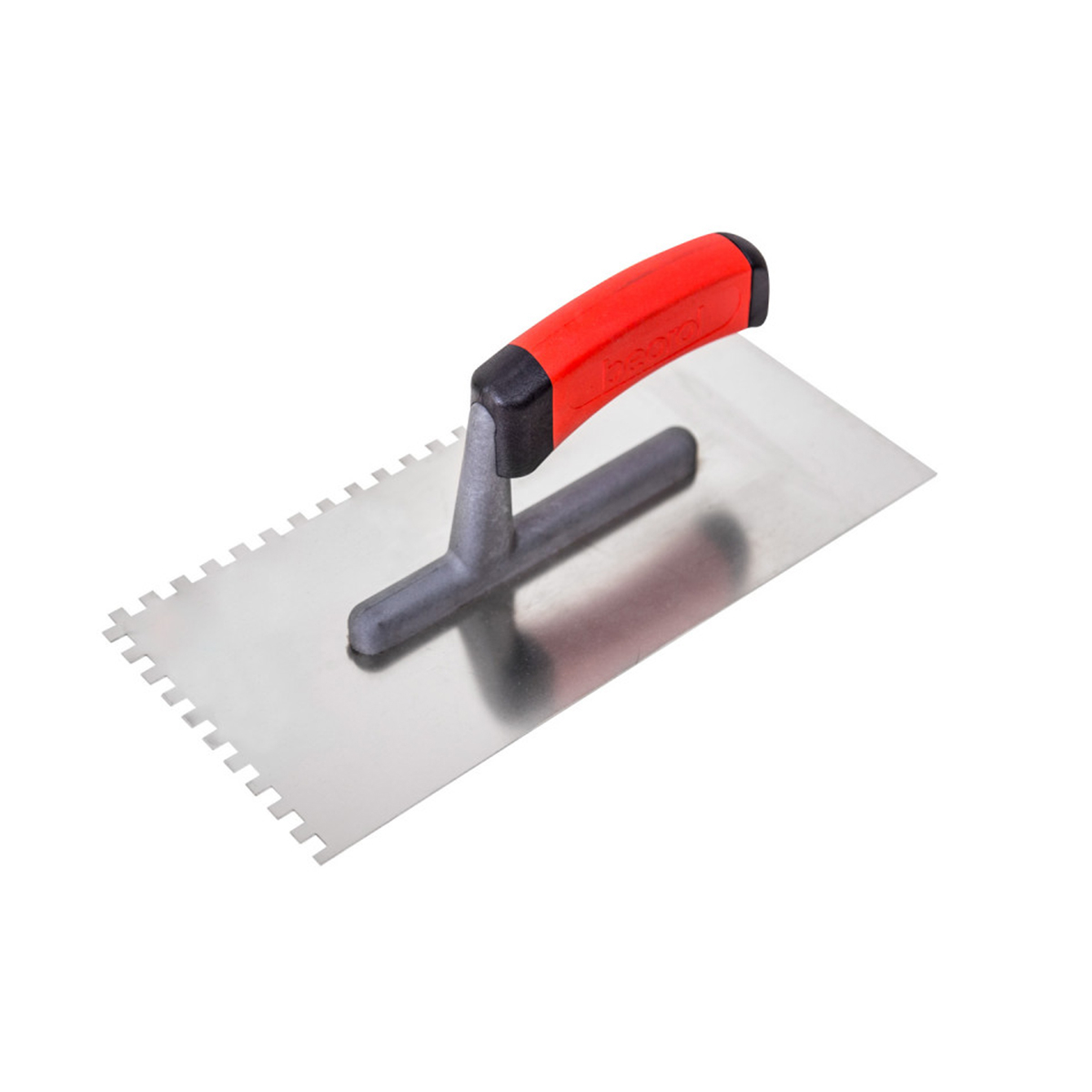 Зубчатая гладилка BEOROL нержавеющая сталь 270x130 мм зуб 6x6 мм двухкомпоненная ручка 245714 обеспечивает равномерное распределение клеевых растворов по поверхности стены или пола.