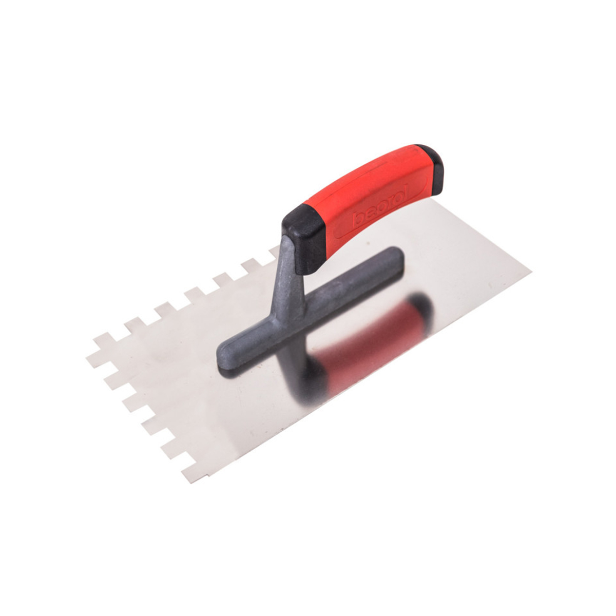 Зубчатая гладилка BEOROL нержавеющая сталь 270x130 мм зуб 12x12 мм двухкомпоненная ручка 245725 обеспечивает равномерное распределение клеевых растворов по поверхности стены или пола.