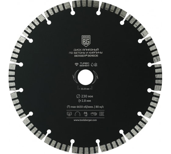 Диск алмазный отрезной по бетону и кирпичу турбо-сегментированный 230x2.8x22.23 мм Berger BG1606 предназначен для использования с УШМ.