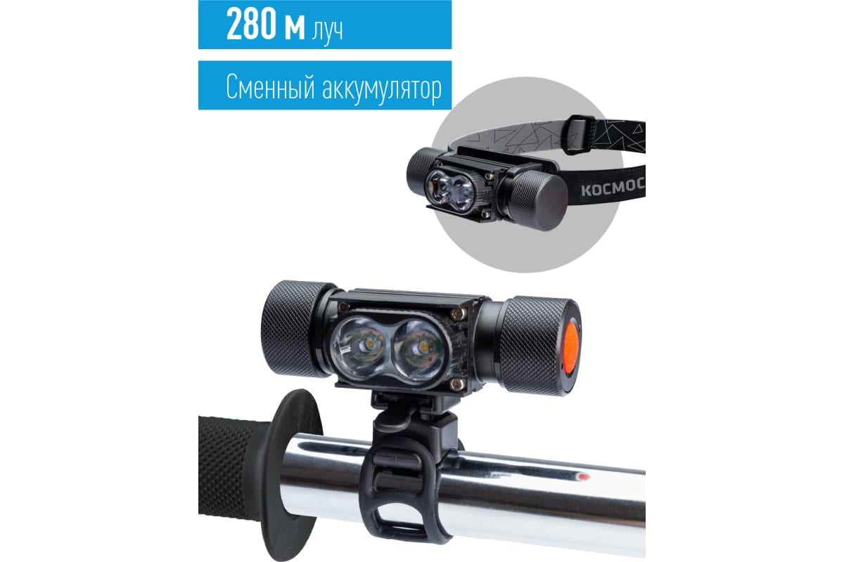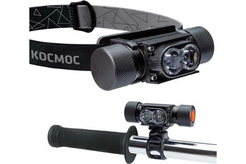 Налобный велосипедный аккумуляторный фонарь КОСМОС 10Вт LED, съемный Li-ion 18650 1200mAh, алюминий, USB шнур (584452)
