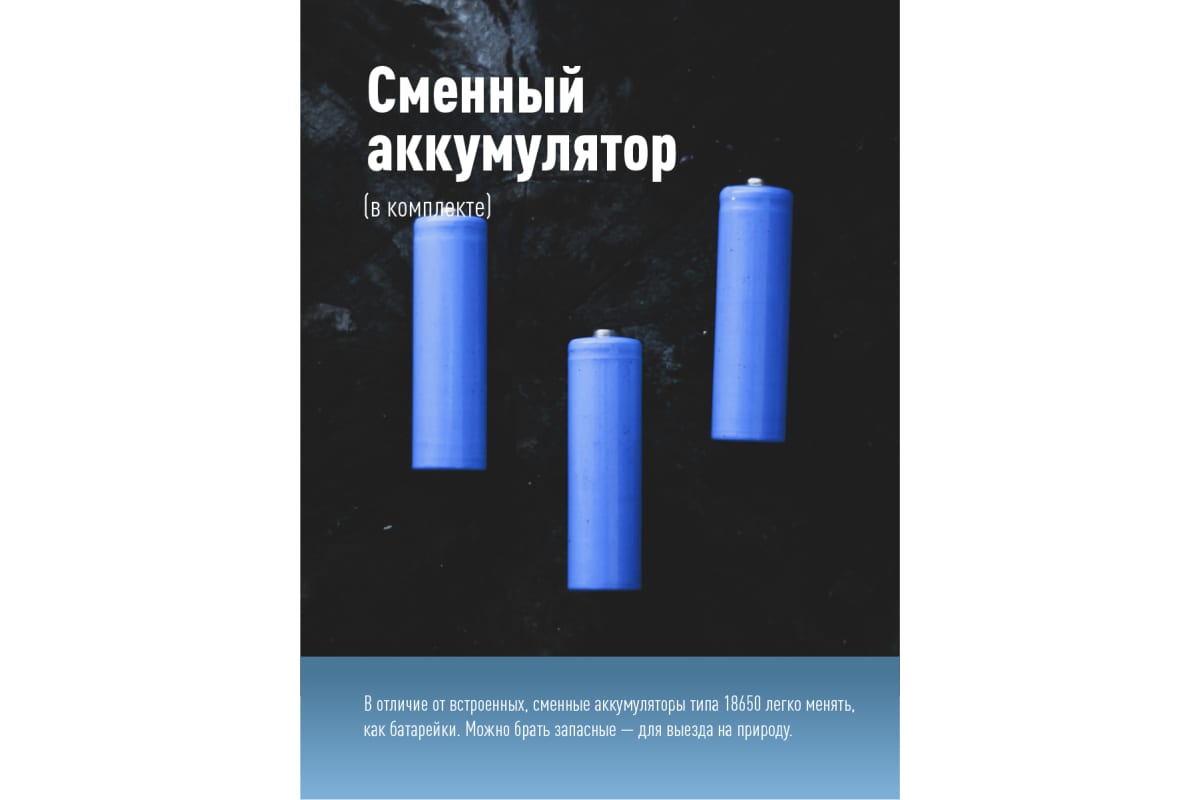 • Фонарь со съемным аккумулятором 18650 в комплекте.