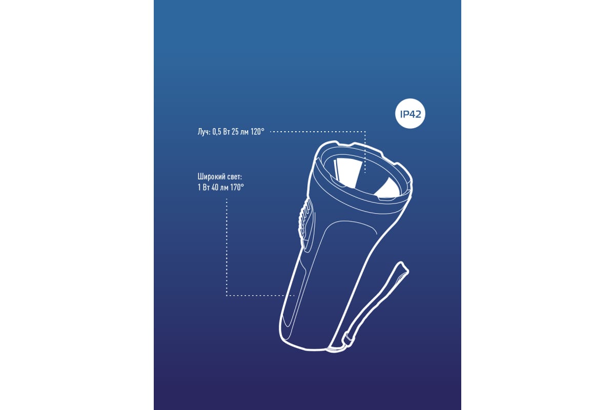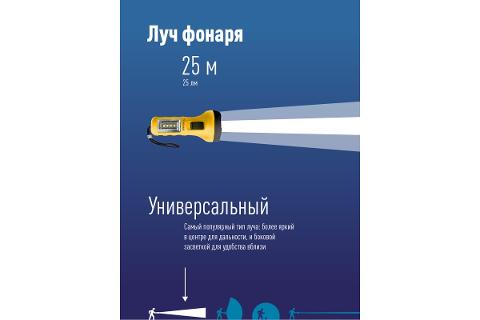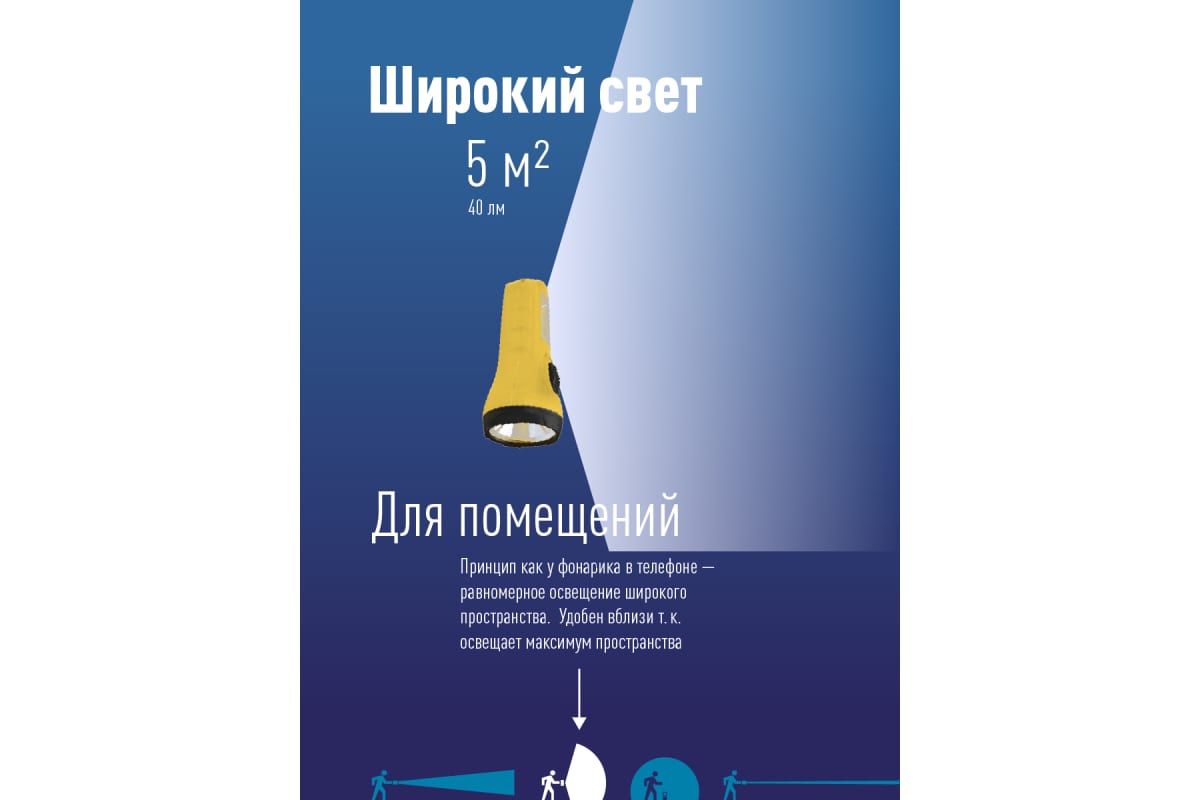 • Совмещает луч фонаря (направленный свет) и широкий свет (освещает широкое пространство с одной стороны).