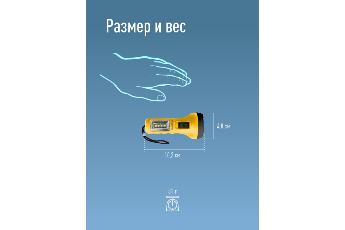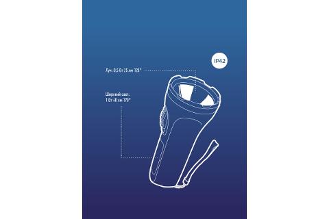 • Источник света: 1LED (0,5Вт); боковой светильник 4SMD LED(1Вт). Количество режимов: 2 (луч-боковой светильник). Световой поток: 25 лм. (луч)/40 лм. (широкий свет, боковой светильник).