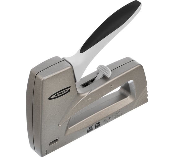 Мебельный степлер Gross Aluminium 140 41007 в литом алюминиевом корпусе работает со скобами типа 140 размером 6-14 мм и гвоздями типа 300 размером 16 мм, оснащен двухпозиционным регулятором силы удара и эффективен при работе с тканями, ПВХ-пленкой, а также фанерой, оргалитом, ДВП и ДСП. Двухпозиционный регулятор силы удара облегчает работу с твердыми материалами.
