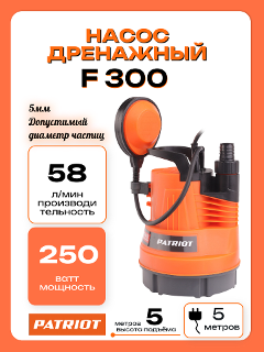 • Дренажный насос PATRIOT F 300 315302417 способен перекачивать чистую воду.