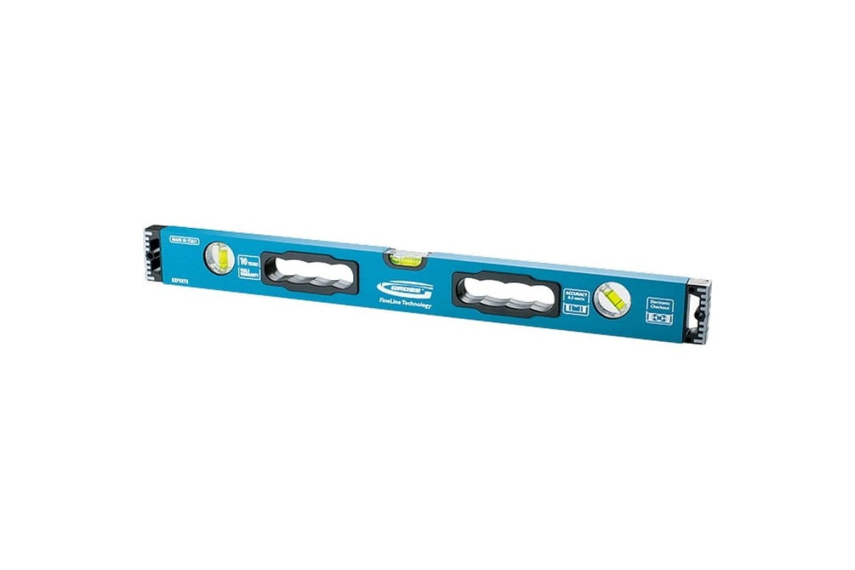 Алюминиевый уровень 1500 мм, усиленный с ударопрочными заглушками, рукоятки, 3 глазка GROSS 34335 подойдет для эксплуатации в сложных, стесненных условиях.