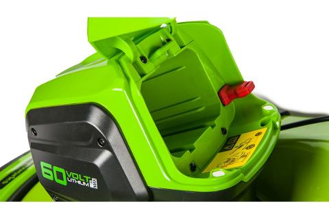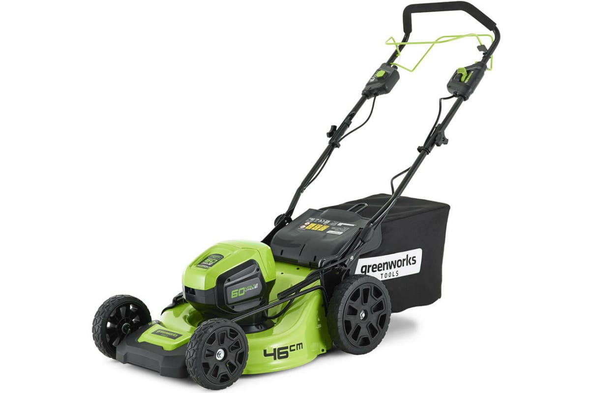 Бесщеточная самоходная аккумуляторная газонокосилка Greenworks GD60LM51SP 60 В, c АКБ 4 А*ч и ЗУ 2514307UB используется для скашивания травы на частном участке.