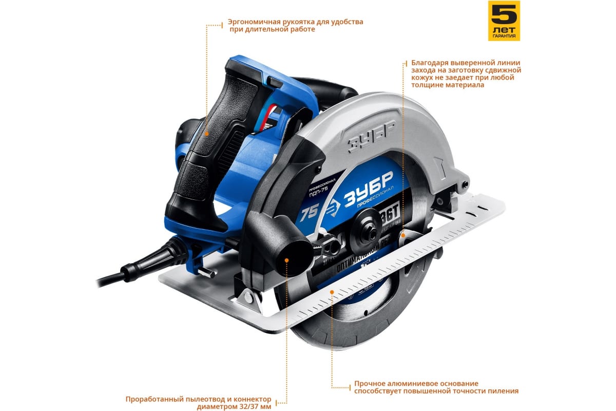 Дисковая пила Зубр ПРОФЕССИОНАЛ ПДП-75 разработана для распиловочных работ по дереву. За счет небольших габаритов и малого веса отличается маневренностью и удобством пользования.
