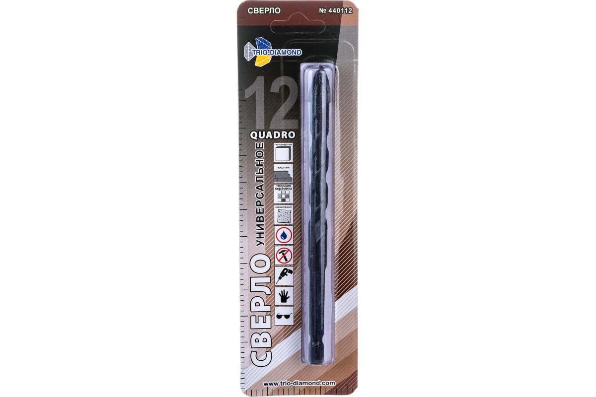 • Сверло универсальное квадро TRIO-DIAMOND 440112 служит для работы с шуруповертом, дрелью в безударном режиме.