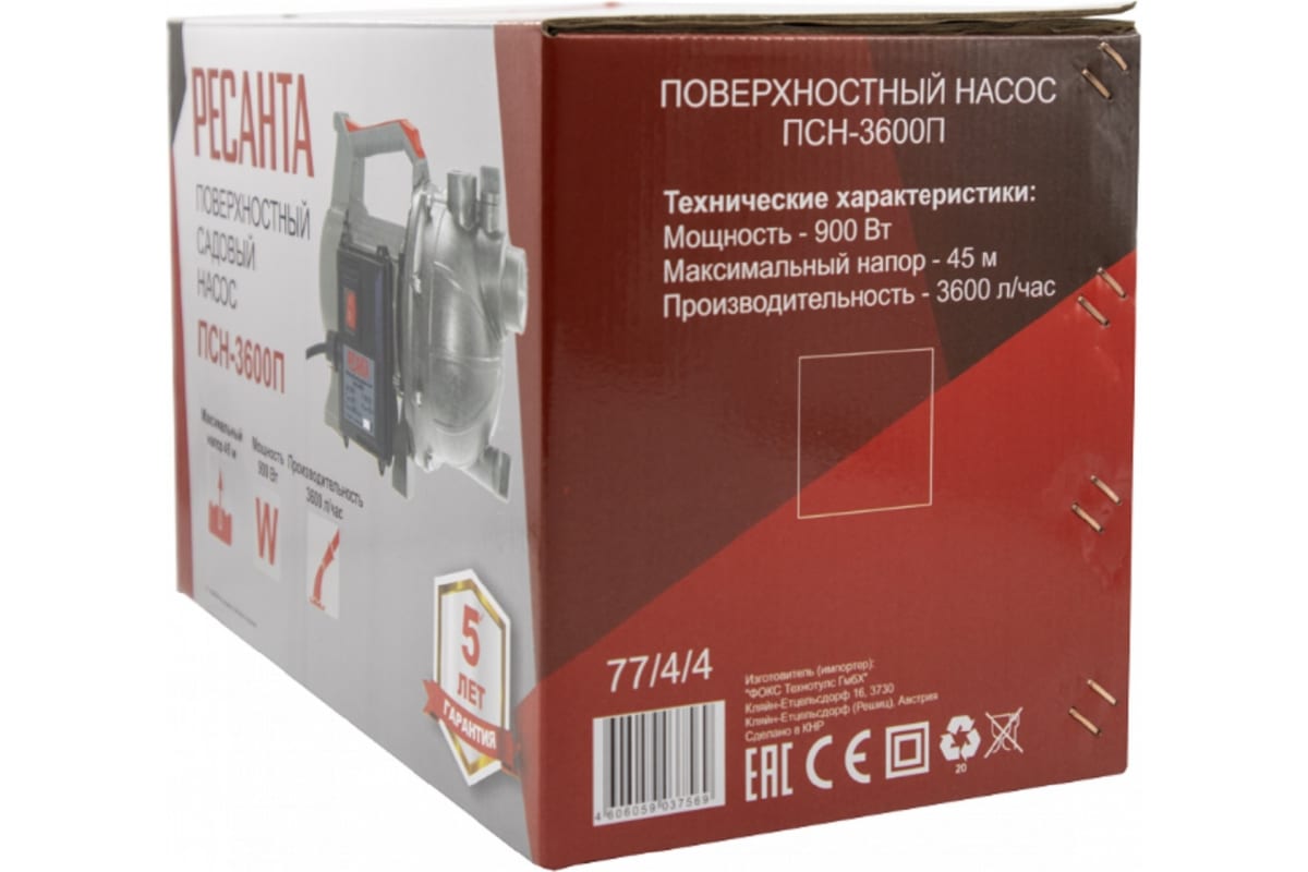 Поверхностный насос Ресанта ПСН-3600П 77/4/4 предназначен для подачи под давлением чистой воды в дом, для орошения сада и огорода. Вода не должна содержать абразивных или волокнистых, а также химических составных частей, которые могли бы повредить материал деталей насоса.