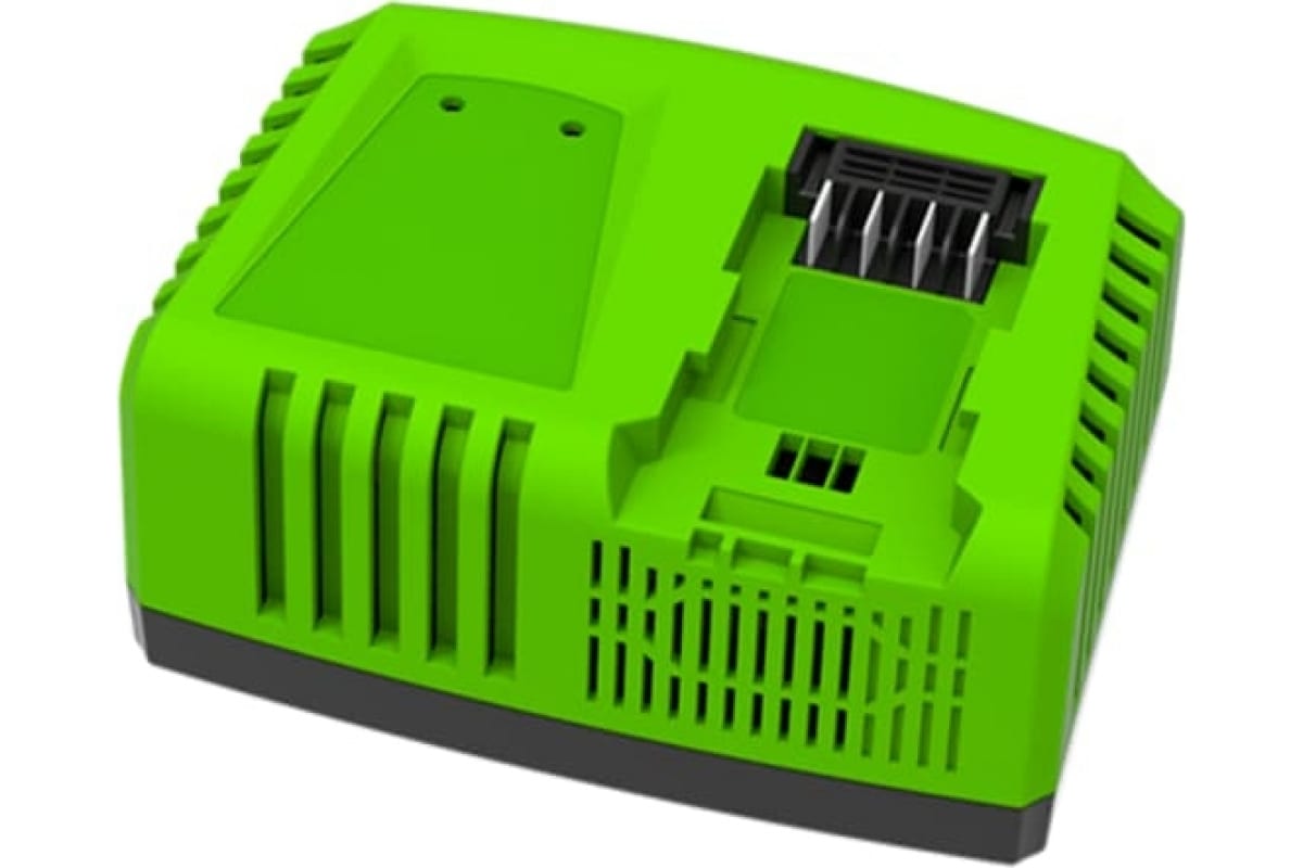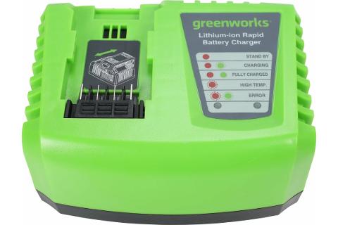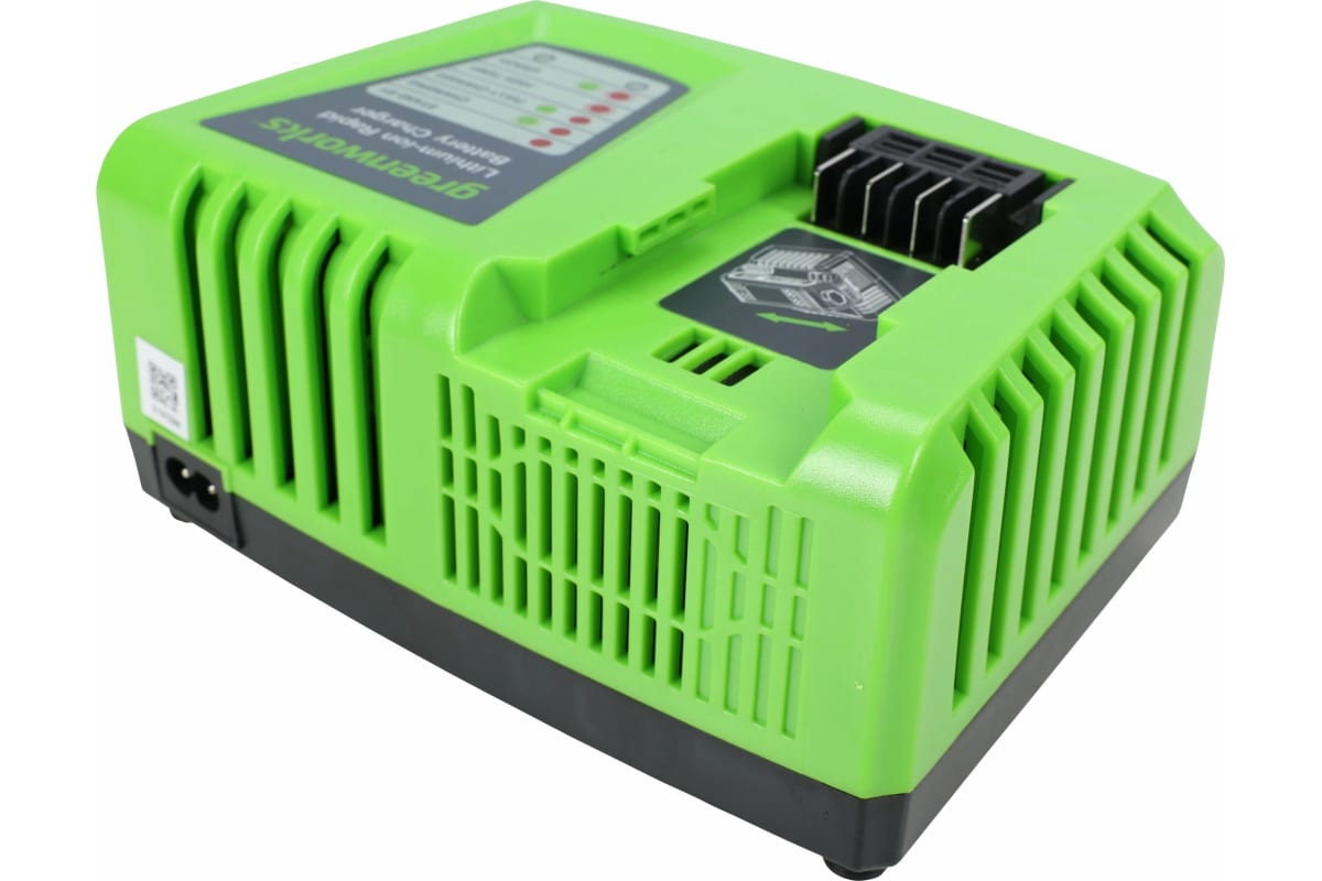 Быстрое зарядное устройство G40UC55 Greenworks 2945107 заряжает в 2 раза быстрее, чем обычная зарядка! Подходит для 2 Ач и 4 Ач аккумуляторов серии Greenworks 40V.
